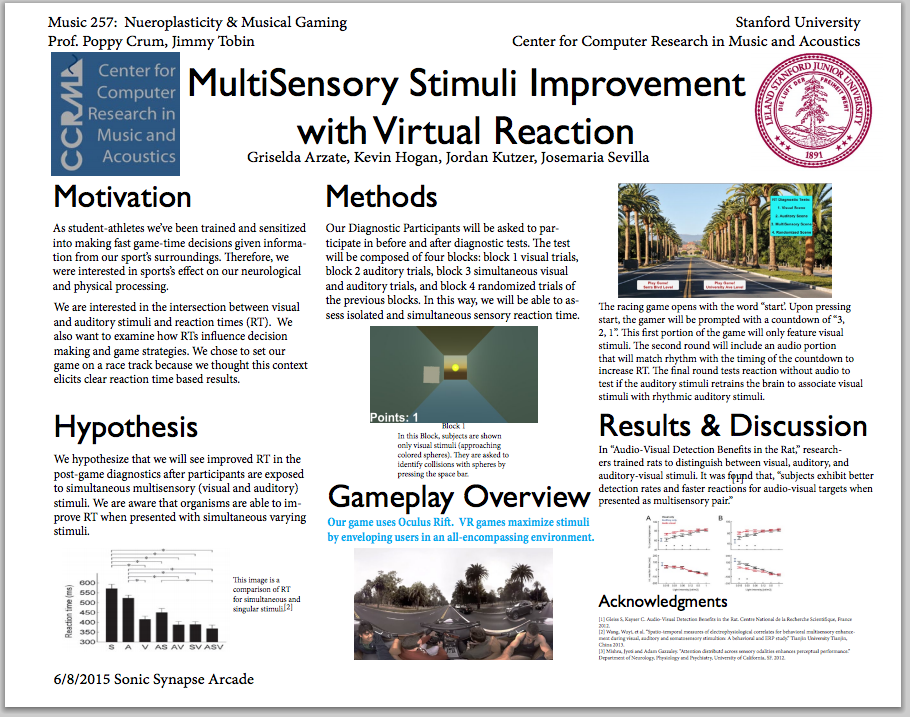 This truly describes the premise and experience of Virtual Reaction, an immersive Virtual Reality (VR) game. My team created this interactive training game to improve a user’s sensory processing and reaction times. We hypothesize that Virtual Reaction maximizes users’ stimuli and engagement which results in better training and more fun.